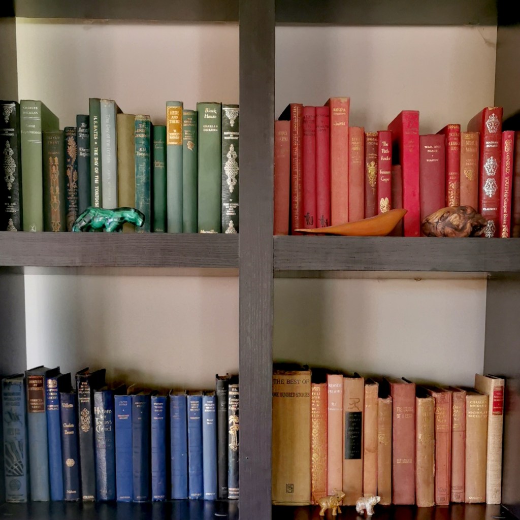 - Sorting my bookshelves – the annual local book fair is a good incentive to sort through my bookshelves and I recently sorted them into fiction, non-fiction, poetry, philosophical & spiritual, art books, and old hardcovered classics that I have sheepishly organized by colour because I like how it looks.