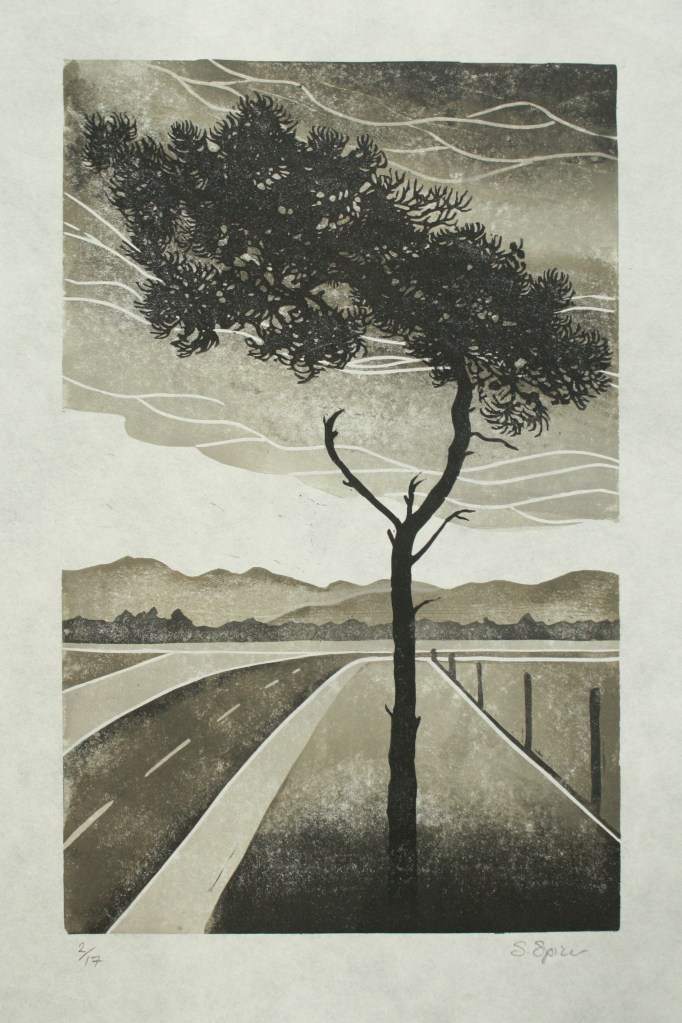 This linocut features the Maritime Pines (Pinus pinaster) that you can see along Harper Avenue in Hagley Park, Christchurch. I wanted to capture their strong trunks reaching up into the sky.