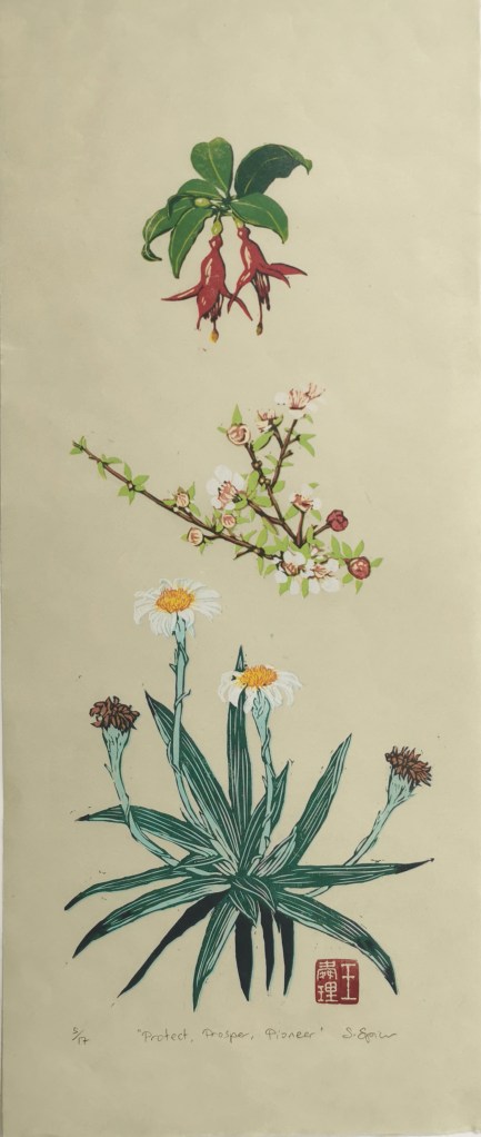 This piece considers how although our native plants are highly vulnerable to fire, and the threat to them increases as our climate changes, these three plants are not defenseless. Kōtukutuku, tree fuchsia, can be planted as a green fire break. Mānuka releases its seeds in response to fire; and Tikumu, mountain daisies, are able to pioneer into spaces that have been disrupted by fire. The composition of this piece echoes the form of a flame, and I experimented with flat, bright colours and lots of empty space.