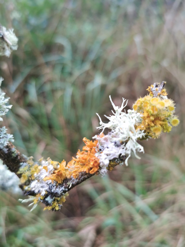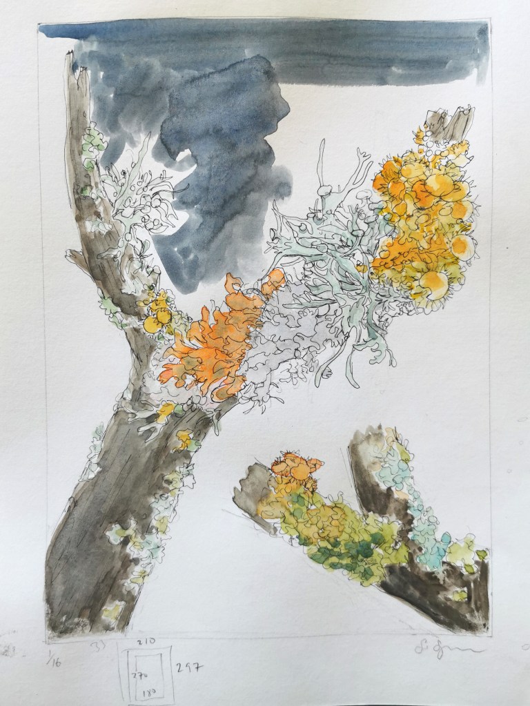 This was the lichen laden branch I came across while walking the Bluff track above the Waikirikiri river. It is a miracle of colour, structure and fine detail, and I thought it would make a great subject both for a small print exhibition I have entered in Japan, and for the series of botanical linocuts I am creating over the course of this year.