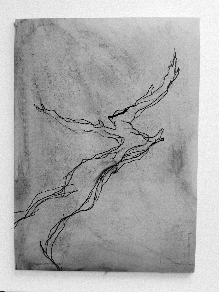 This was the initial design I prepared for a linocut. However, when I came to draw it on to the lino, I wasn’t happy with the composition. I redrew it several times over the course of some weeks.