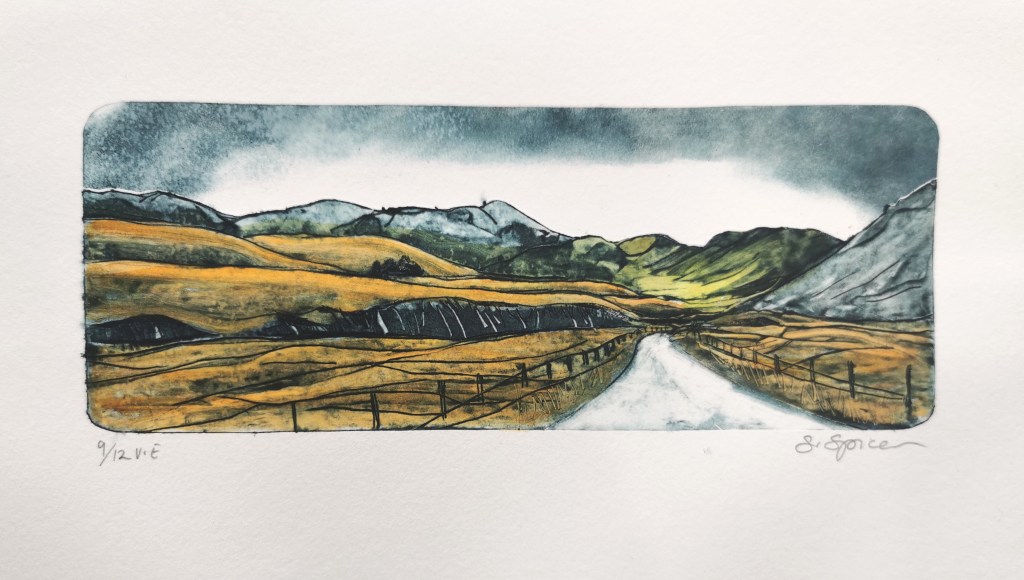 I enjoyed the challenge of conveying a sense of shifting light and wide expanse into a small print, and used composition, mark-making and tone to do so. This piece was created by scribing the inside of almond milk tetrapak carton, wiping Charbonnel Aquawash etching ink over it, and printing it to damp Fabriano Rosaspina paper. It was then hand coloured with watercolour.