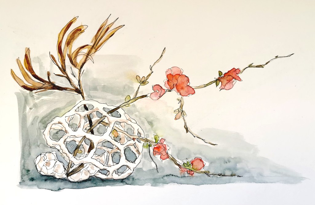 The second design for Strange Company features our native basket fungus (which has many Te Reo names, including tūtae whetū and tūtae kēhua), harakeke seed pods, and japonica sprigs, which I have been encountering along the fence lines on my winter rambles. I’ve always found basket fungus to be far-fetched, and I am fascinated by the japonica’s spiky tendrils and clumps of bright blooms in the middle of winter. The harakeke’s seed pods are sculptural and finger like. They are each peculiar looking, and together become an unexpected arrangement – echoing the way our natives now find themselves unexpectedly in the company of introduced plants like the japonica.