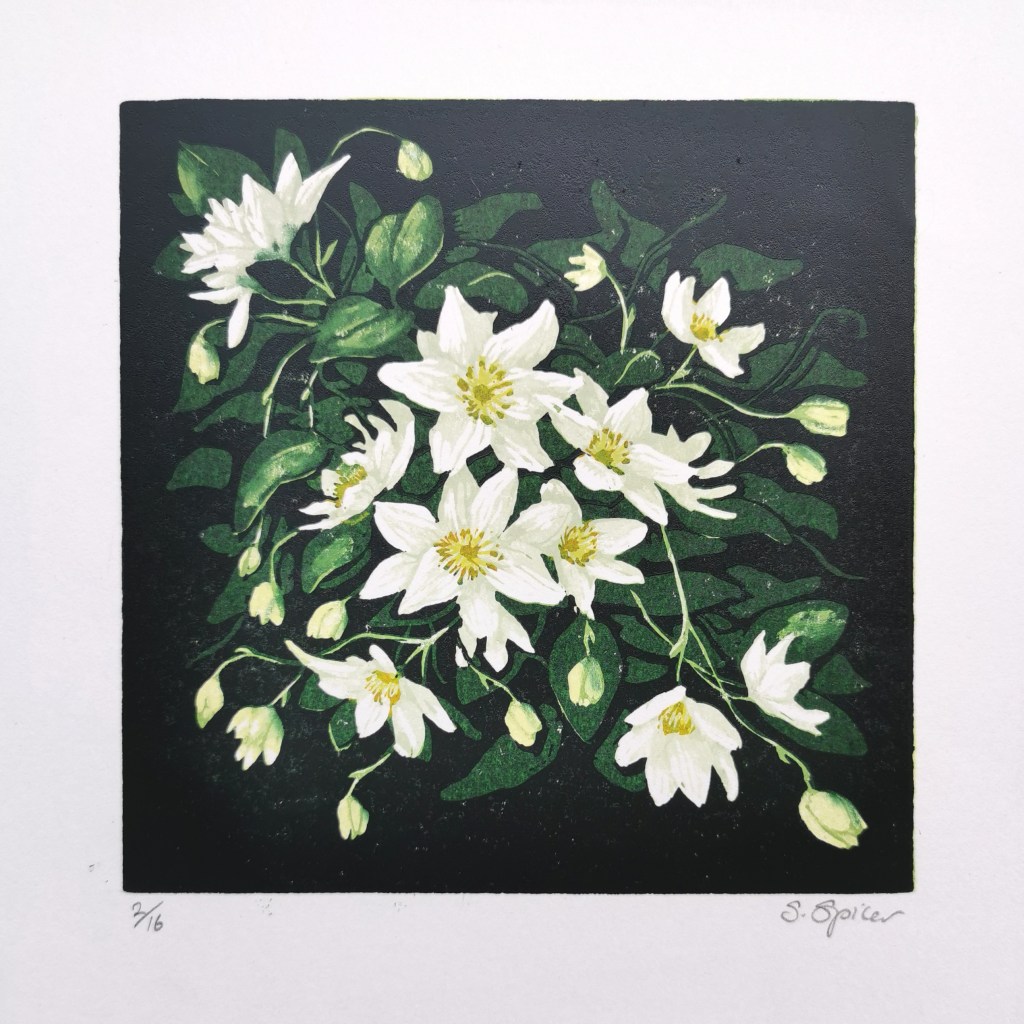 This linocut seeks to portray the whiteness of the flowers emerging from dark undergrowth, achieved by choosing a very white paper and then slowly building up five layers of deepening colour. These were printed by hand from a single piece of lino which is carved away between each layer.