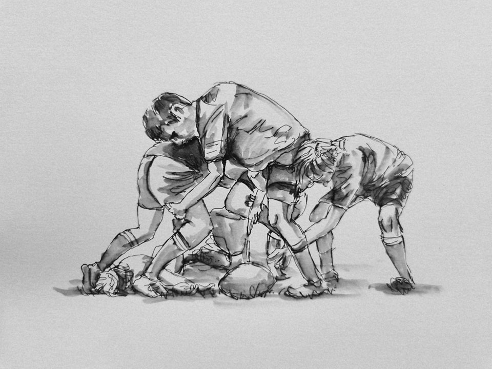 In summer, I sit in the sun, lazily sketching slow cricket games with a thermos of tea. Now in winter, rugby is too fast paced to sketch live so I’ve been working from photos instead.